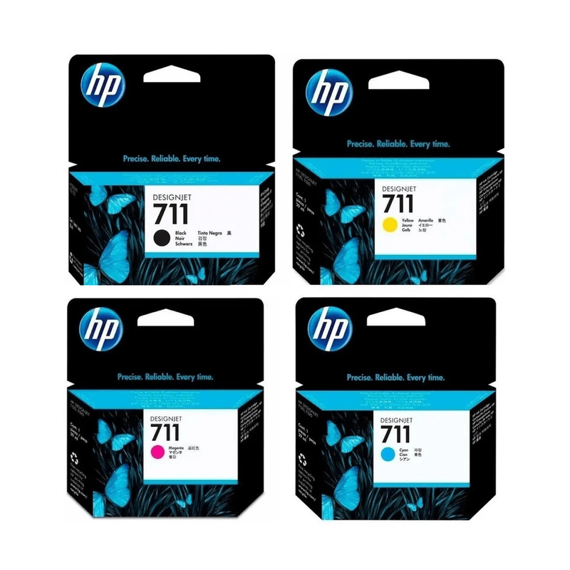 Aproveche el Combo de Cartuchos de Plotter HP 711 Negro 38ml. + 711 Colores 29ml., comprende los colores Negro, Magenta, Amarillo y Cyan. Con una capacidad de 38 ml. Negro, 29 ml. Colores. Este Combo de Cartuchos de Tintas Originales fabricado por HP. Es sin dudas un producto de calidad destacable. Contiene un Cartucho HP 711 Negro (Codigo de Fabricante CZ129A), un Cartucho HP 711 Cyan (Codigo de Fabricante CZ130A), un Cartucho HP 711 Magenta (Codigo de Fabricante CZ131A) y un Cartucho HP 711 Amarillo (Codigo de Fabricante CZ132A).