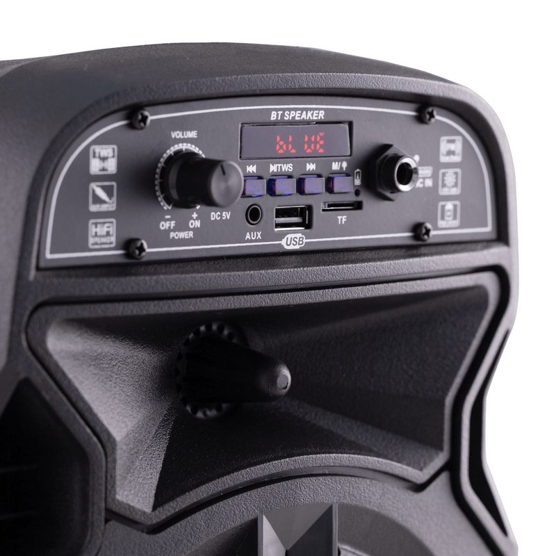 - Tipo de parlante: bluetooth. - Con conectividad bluetooth. - Tiene luces led. - Función de karaoke incorporada. - Batería recargable. - Potencia de 550W. - Conector de entrada: USB. - Lugar de colocación: el piso. - Con sintonizador de radio.