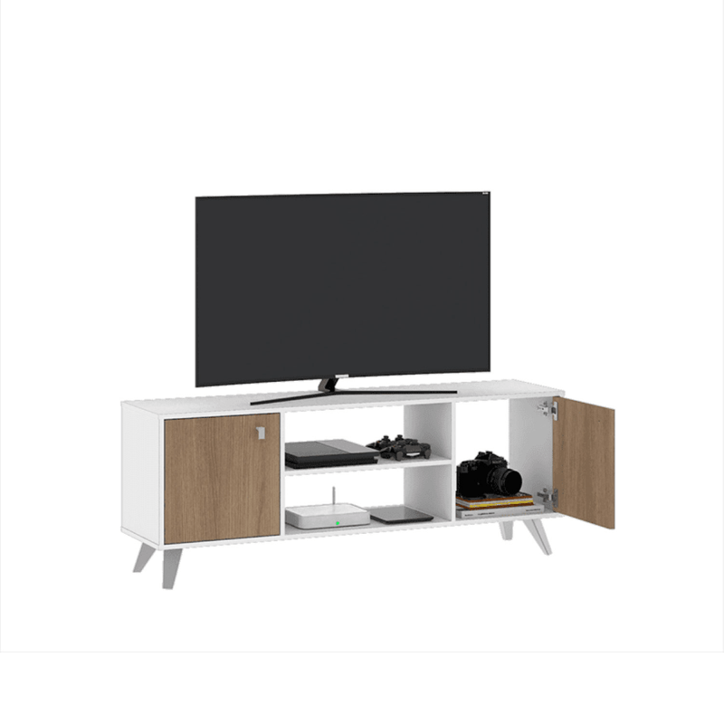 - El diseño está compuesto por un cuerpo principal de melamina y patas de PVC. Este mueble posee tres divisiones internas, dos cerradas con puertas y una libre, con la intención de tener un espacio para exhibir elementos decorativos y artefactos que tengan controles remotos.