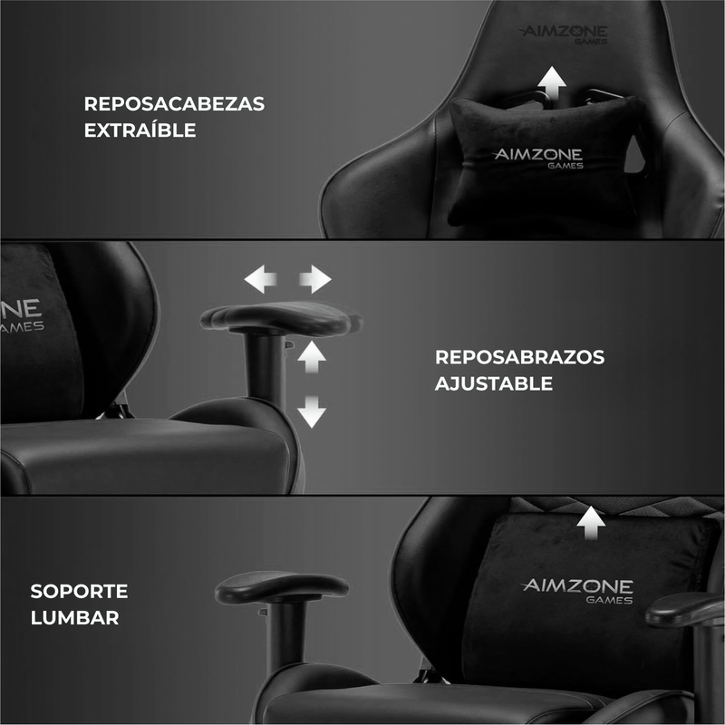 - Características especiales: Altura Ajustable, Reposabrazos, Reposacabezas ajustable, Respaldo ajustable, Zona Lumbar Ajustable.